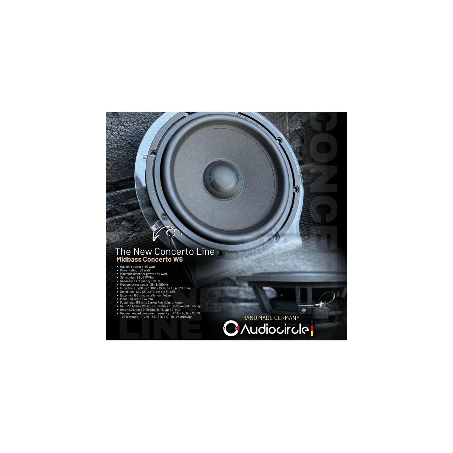 Il woofer Audiocircle CL-W6 della linea Concerto è un componente High End da 165 mm realizzato a mano in Germania. Grazie alla membrana in composto di carta e lana e al cestello in alluminio pressofuso, offre una riproduzione dei bassi profonda e controllata, con una linearità eccezionale tipica della produzione artigianale Audiocircle.